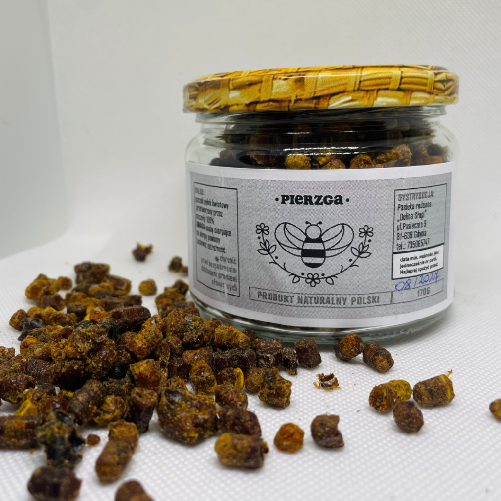 Mieszanina pyłku kwiatowego, nektaru, miodu i enzymów, które pszczoły formują w małe, kuliste kuleczki. Pierzga pszczela jest bogata w białko, witaminy, minerały, kwasy tłuszczowe, enzymy i inne składniki odżywcze. Uważa się, że wspomaga odporność, poprawia energię, wzmacnia organizm i pozytywnie wpływa na skórę.